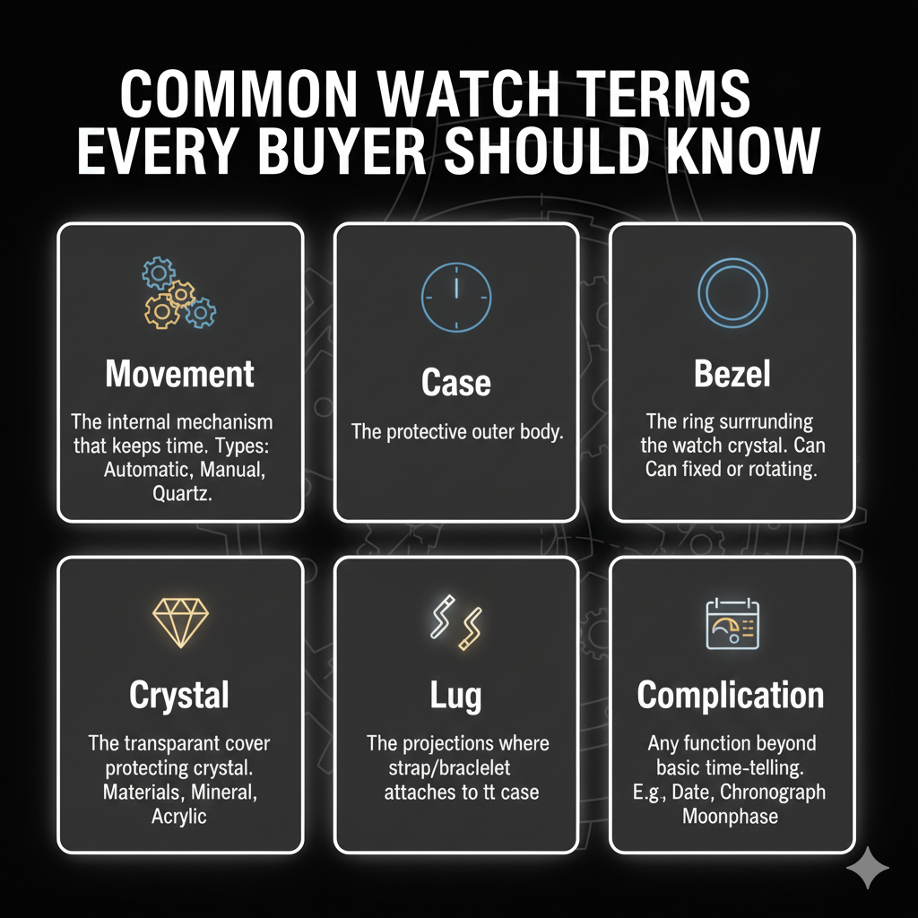 Understanding basic watch terminology helps you shop with confidence and appreciation. Whether you’re buying your first watch or building a collection, knowing these terms allows you to compare models properly and understand what you’re paying for.